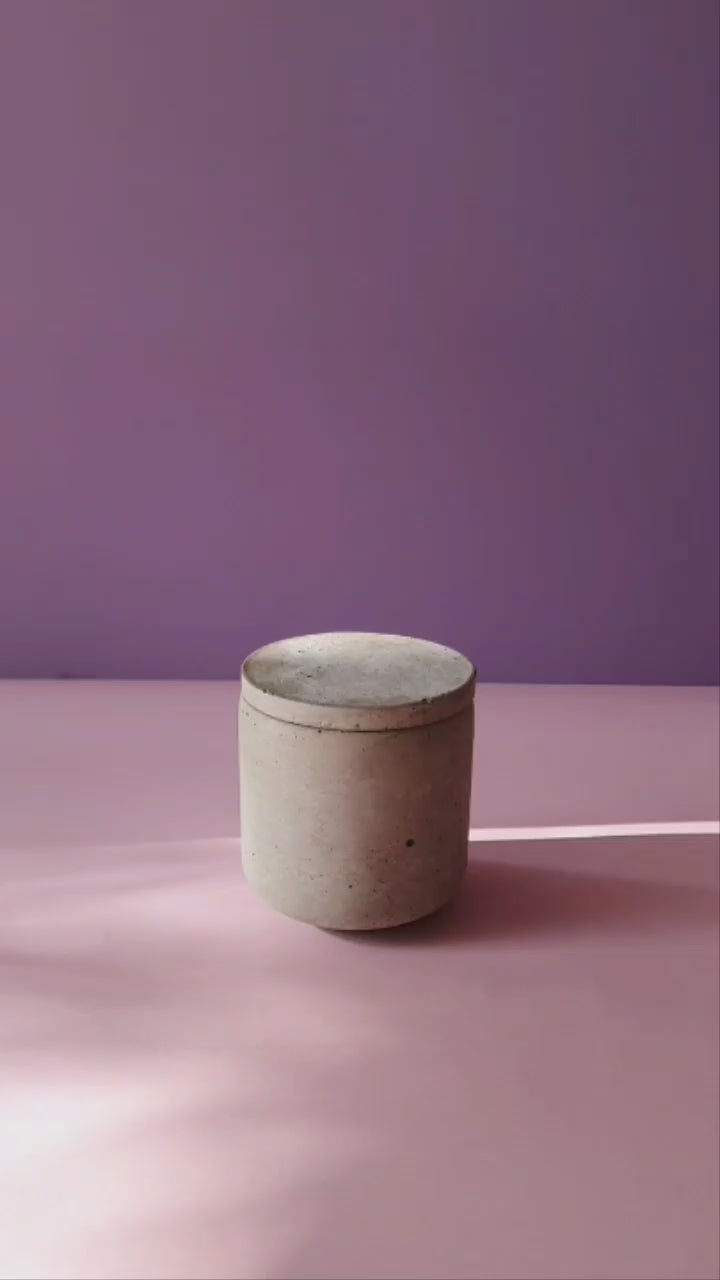 A Mimi tárolóedény egy pici, fedeles beton dobozka ékszereknek, kozmetikai korongoknak, hajcsatoknak, hajgumiknak vagy más apróságoknak. Megvédi tartalmát a portól és a nedvességtől, miközben a beton súlya, kellemes anyaga és természetes textúrája használatkor egy kis örömöt csempész a napodba.